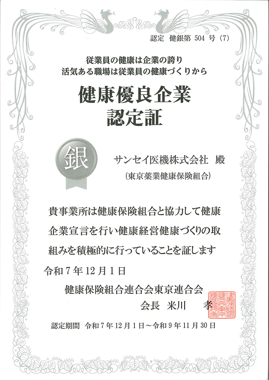 サンセイ医機株式会社は、健康保険組合連合会東京連合会に「健康企業宣言」を行い、次の通り積極的な健康経営への取り組みを実施、2018年11月7日付で、「健康優良企業(銀の認定証)」を取得いたしました。(健銀第504号)